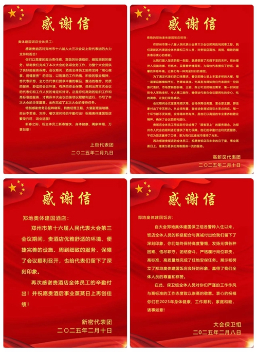 2025年2月10日,鄭州市第十六屆人民代表大會第三次會議第二次全體會議勝利閉幕。鄭州城市發(fā)展集團旗下河南鄭地奧體建國飯店作為本次大會的駐地保障酒店,以“五星”服務(wù)標準(環(huán)境舒心、食宿貼心、細節(jié)暖心、保障安心、文化潤心),圓滿完成了各項接待任務(wù),贏得了與會代表和會務(wù)組的一致好評。
