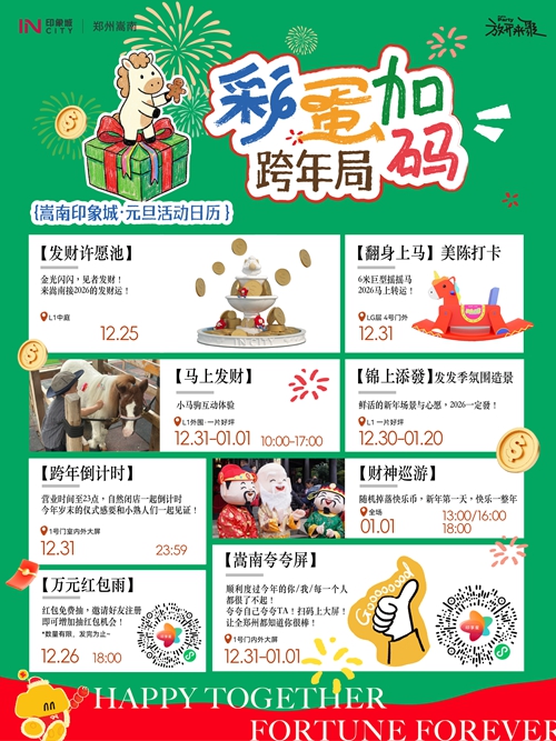 12月31日-1月3日,憑快樂幣可免費(fèi)騎小馬、抽獎(jiǎng)、兌換零食禮包,輕松實(shí)現(xiàn)童趣與味蕾雙重滿足??缒暌梗虉鰻I業(yè)時(shí)間延長至23:00后自然閉店,大屏同步跨年倒計(jì)時(shí),和親友一起在歡呼聲中迎接2026,氛圍感直接拉滿!